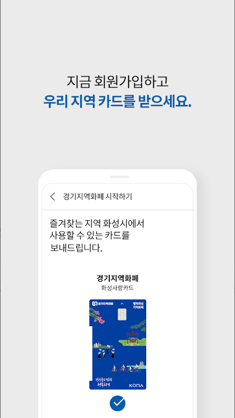 - 복잡한 계좌 개설이나 은행 방문 없이, 앱에서 경기도 내의 사용하실 지역 카드를 지금 신청해 보세요.